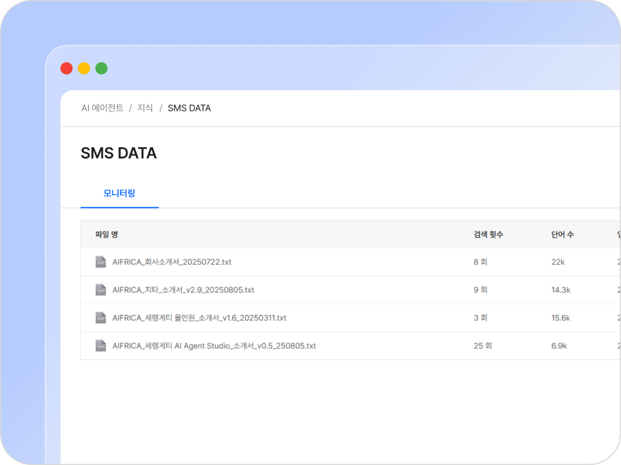 세렝게티 AI Agent Studio의 “지식“ 기능에서 다양한 형식의 문서들을 간단히 등록할 수 있습니다. 업로드만으로 자체 문서기반의 RAG서비스를 구현합니다.