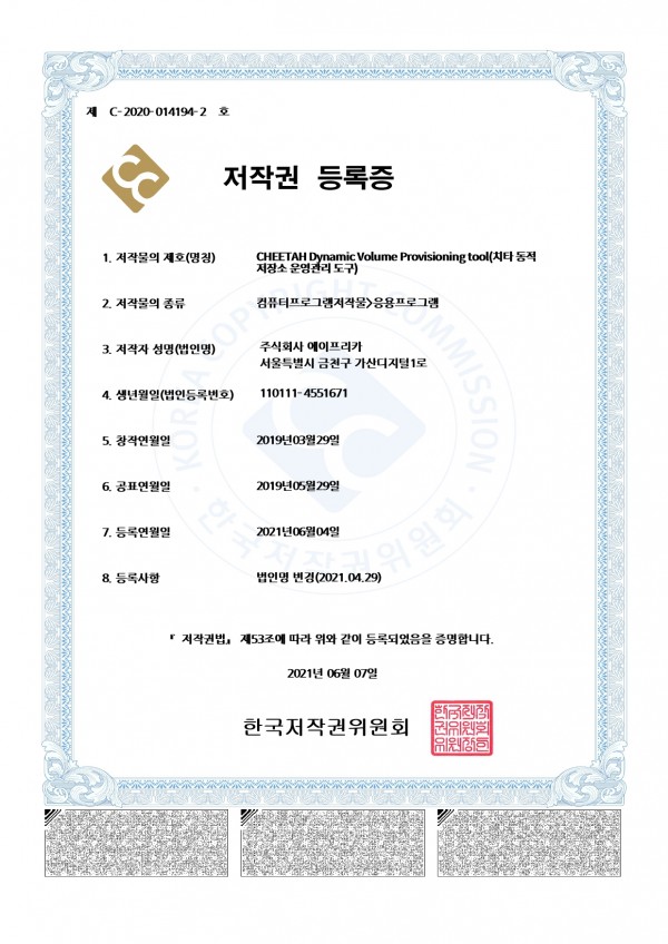 저작권등록증_CHEETAH Dynamic Volume Provisioning Tool(치타 동적 저장소 운영관리도구)