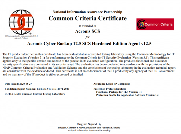 아크로니스 Common Criteria 인증서