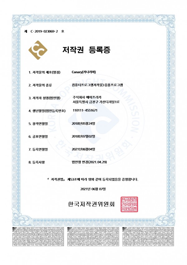 Canary 저작권 등록증