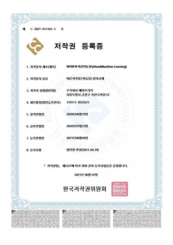 저작권등록증_파이썬과 머신러닝 교안