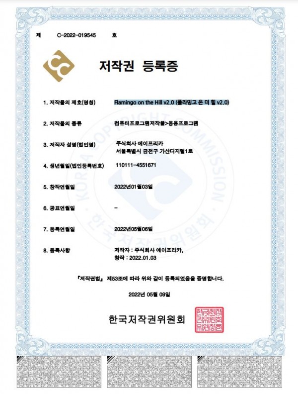 저작권등록증_플라밍고 온 더 힐 v2.0