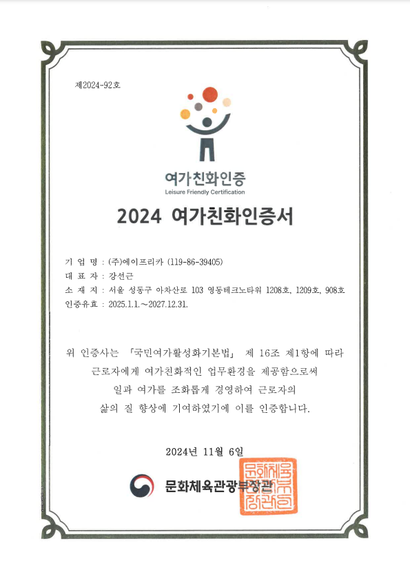 여가 친화기업 인증서