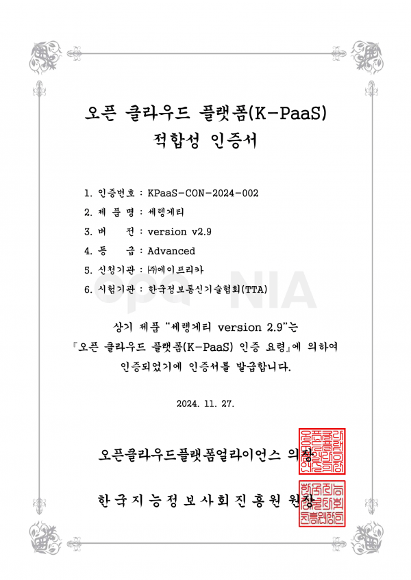 K-PaaS 적합성 인증서_세렝게티