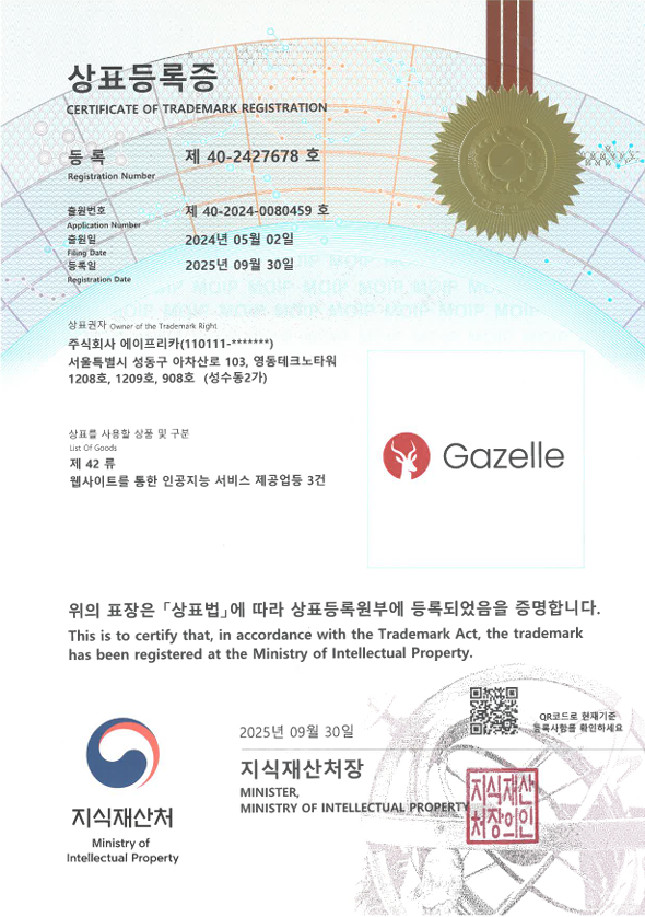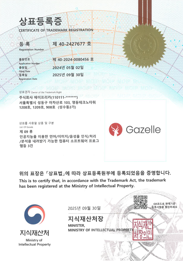 가젤 상표등록증 제42류