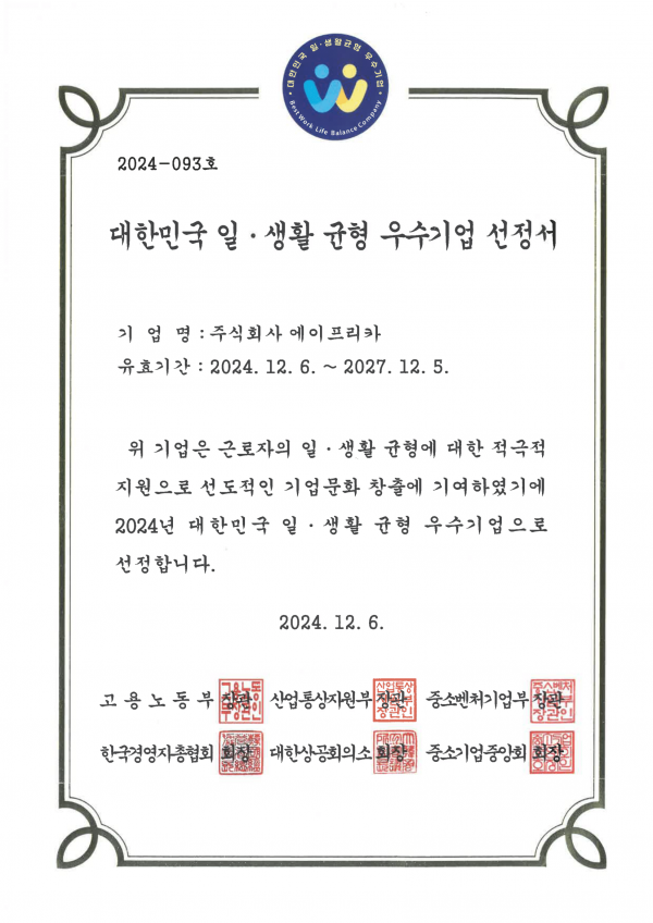 일 ∙ 생활균형 우수기업 인증서