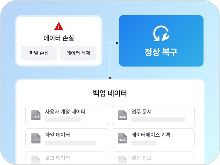 데이터 손실 발생 시 즉시 백업된 데이터를 기반으로 원상태로 복구합니다.