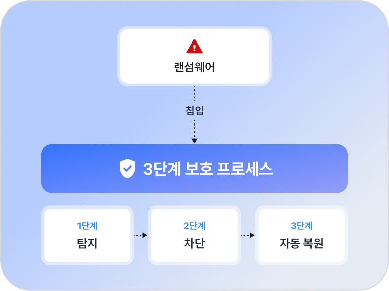 랜섬웨어 침입 시, 데이터 손상 전 실시간으로 대응하는 3단계 보호 프로세스를 가동합니다.