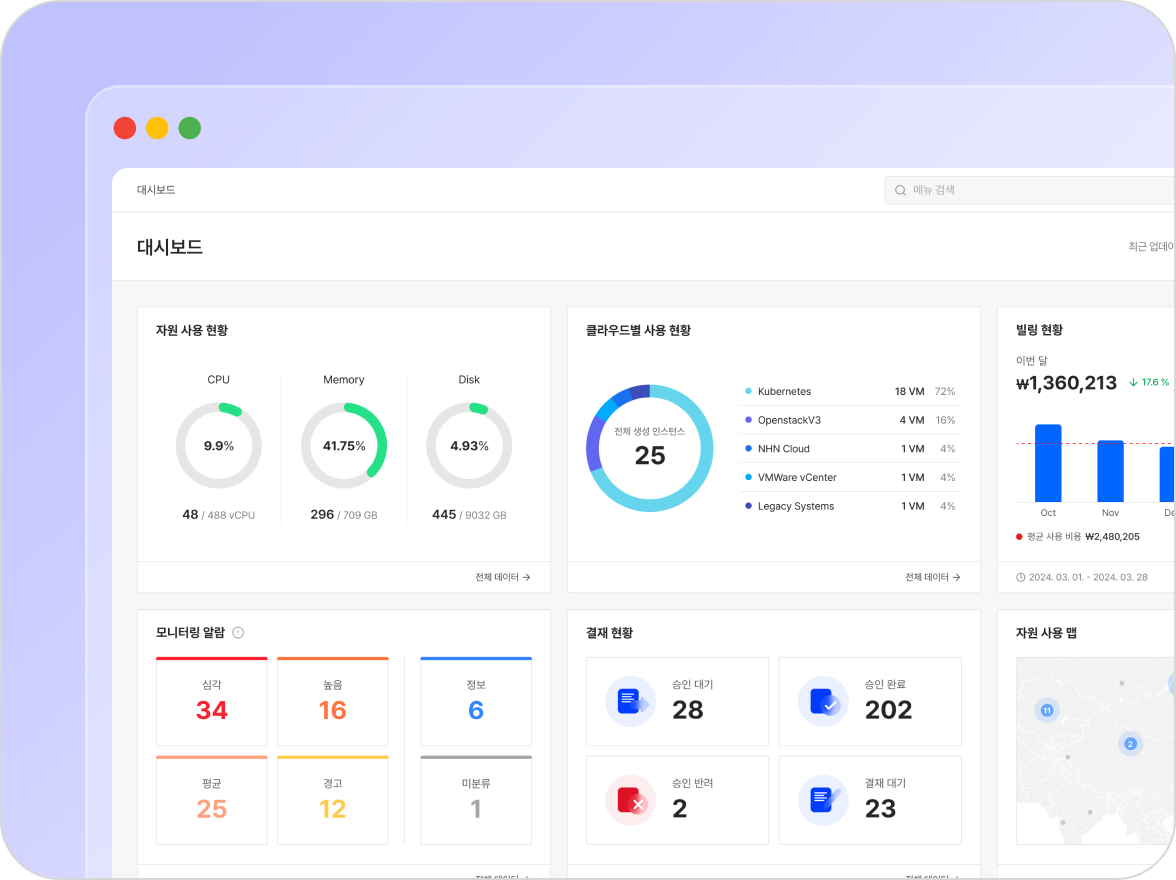 가상머신, 사용량, 트래픽 등 주요 자원 상태를 한눈에 확인하고,