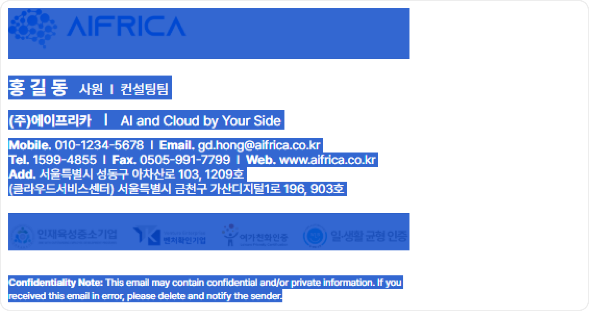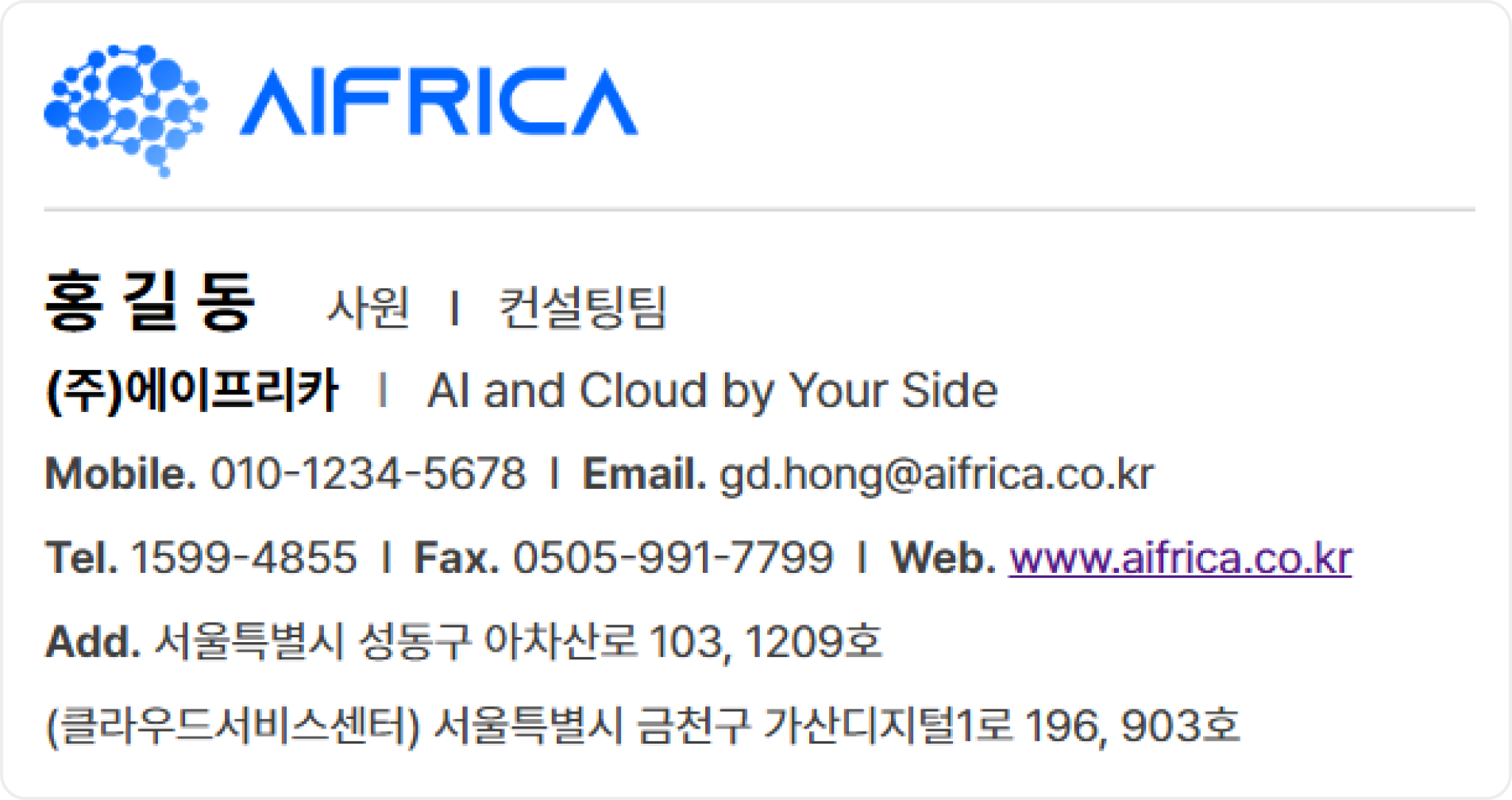 통일된 이메일 서명을 사용하여 모든 서비스와 소통 채널에서 에이프리카의 전문성을 나타내고,
