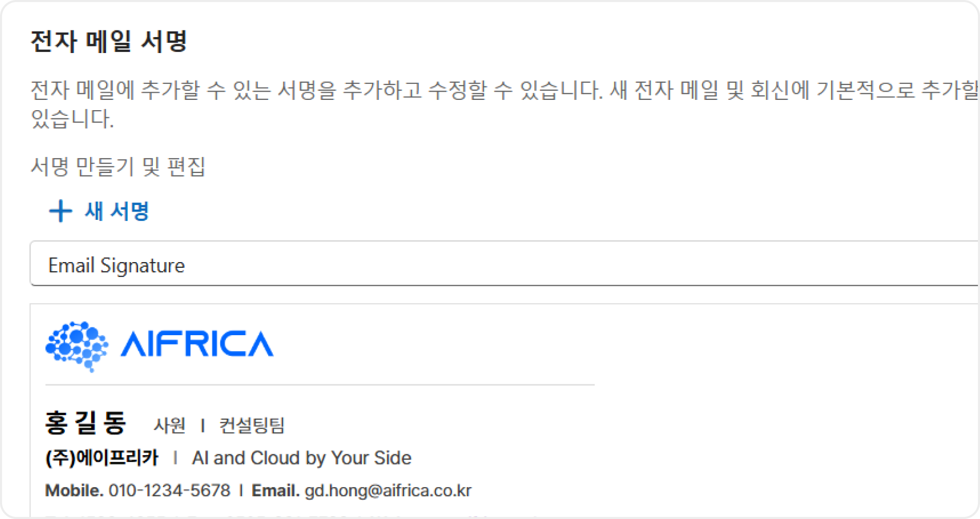 붙여넣은 이메일 서명을 본인의 정보로 수정합니다.