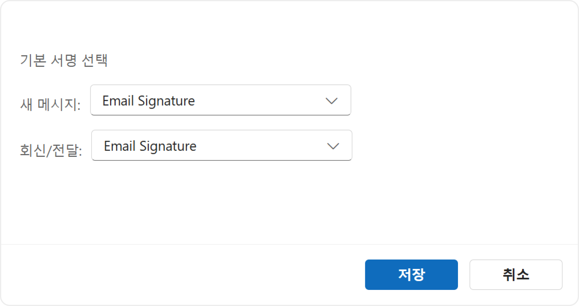 - 6. 기본 서명 선택 새 메시지와 회신/전달 시 적용될 서명으로 선택한 후 저장합니다.